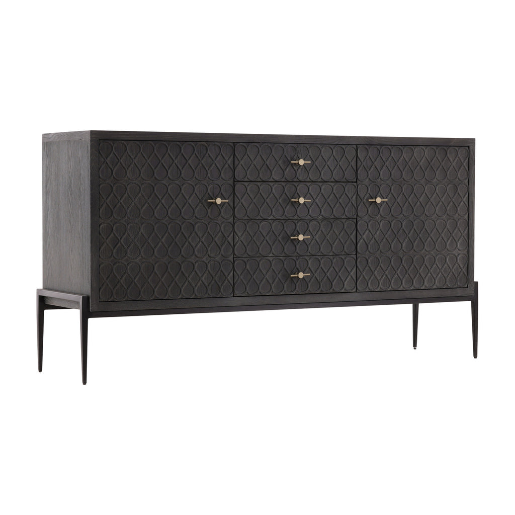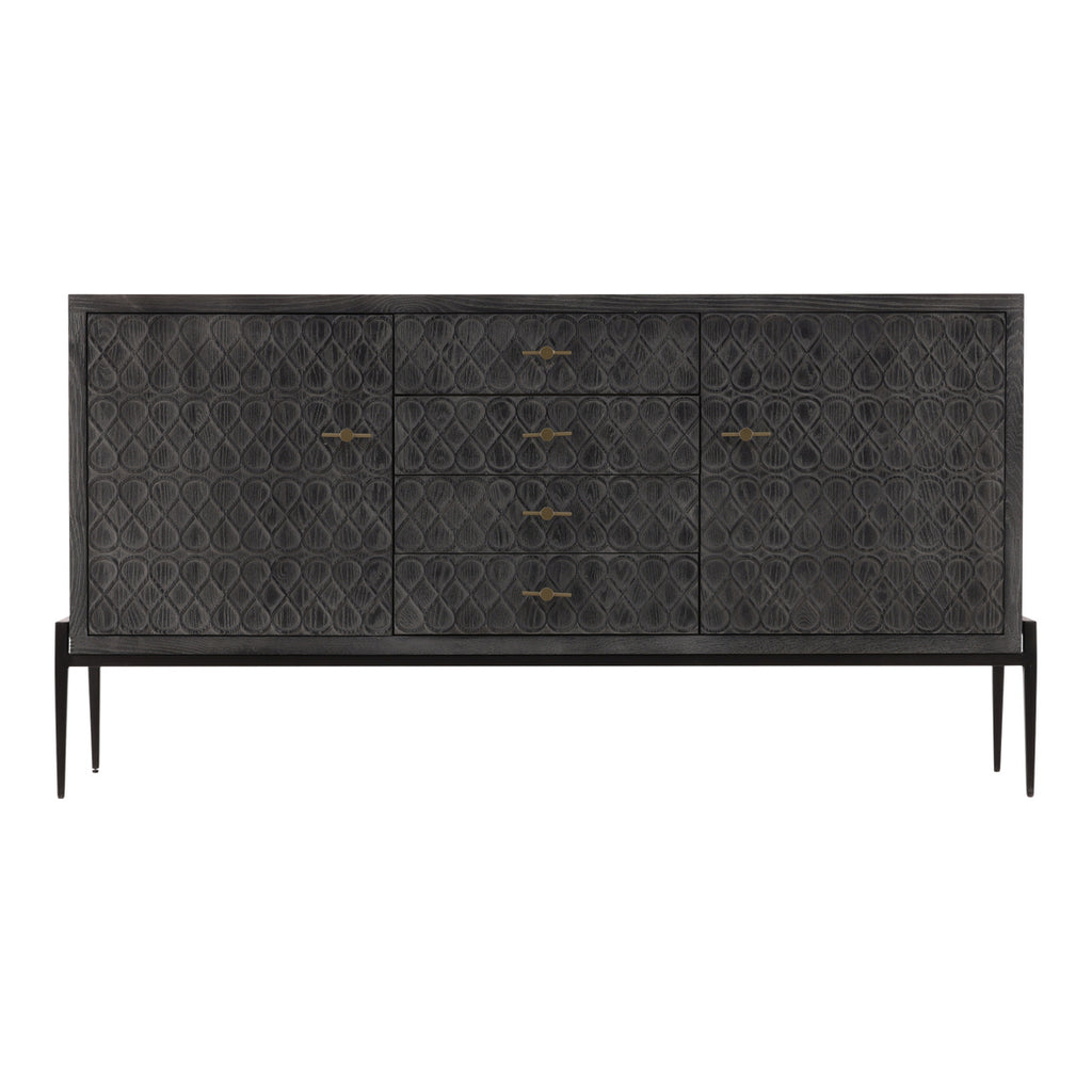 The Sideboard exudes sophistication with its blend of Oak, a marble-inlaid top, and a sleek Iron base. Designed for both style and practicality, it features four doors and two drawers, offering generous storage space. The combination of the charcoal finished wood, luxurious marble, and industrial iron gives this sideboard a timeless yet contemporary appeal, perfect for any modern home.